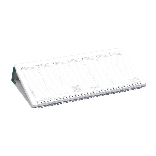 Holland műbőrrel bevont tartóval forgalmazott fehér tömbös, fekvő asztali naptár. A dőlésszög ergonomikus használatot biztosít. Ez a naptár hasznos kiegészítője lehet íróasztalának, otthonának. Jellemzői: Kiváló minőségű holland műbőr. Naptárbeosztás: 6-22 óráig, 8-18 óráig félórás bontásban. Teljes szombat-vasárnap. 54 lap. Tömbméret: 325 × 155 mm. Reklámfelület (a gerincen): 330 × 50 mm