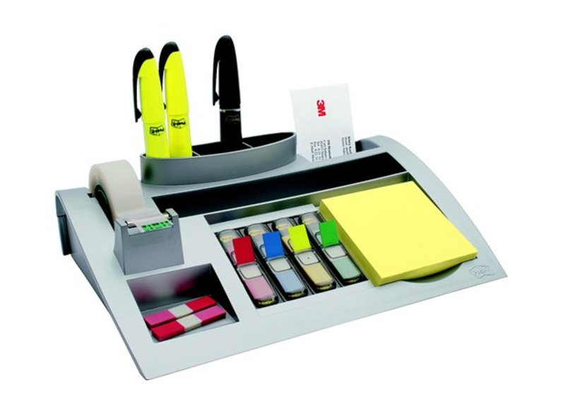 Asztali rendező, ragasztószalag adagolóval, 3M POSTIT C50. Tartalmaz: 4 db keskeny jelölőcímkét. 1 tekercs Magic ragasztószalagot, 1db öntapadó jegyzettömböt, ezüst színben (3-202207)