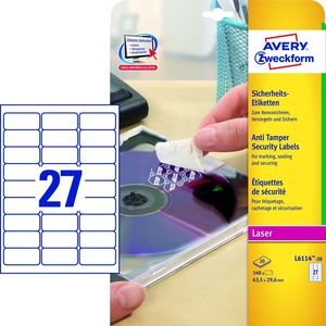 Az Avery Zweckform L6114-20 cikkszámú, fehér biztonsági címkéi monokróm lézernyomtatókhoz, 63,5x29,6 mm méretben tökéletesek tulajdon tárgyaink biztonságos felcímkézéséhez. 540 db, matt felületű, hamisíthatatlan poliészter etikett, 20 íven. A biztonsági címkék látható mintát hagynak maguk után, mindennemű eltávolítási kísérlet azonnal nyilvánvalóvá válik, így megelőzhető az esetleges csalás vagy lopás. Az poliészter film címkék rendkívül tartósak, olaj-, szennyeződés- és hőállóak (-40°C és +100°C között), valamint vízállóak és szakadásbiztosak. Tervezze meg és nyomtassa ki címkéit gyorsan és egyszerűen - ingyenes szoftverünkért és sablonjainkért látogasson el ahttps://www.avery.hu/szoftver weboldalra vagy használja a MicrosoftŽ Office csomagokba beépített sablonjainkat! Kifejezetten monokróm lézernyomtatókhoz és fénymásolókhoz fejlesztve.