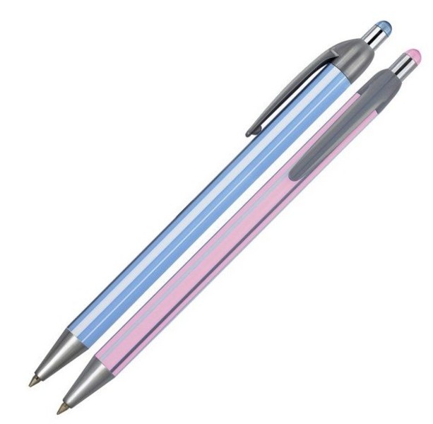 Műanyag, cserélhető betétes golyóstoll. kék és rózsaszín csíkos tolltest vegyesen, kék íráskép, írásszín: kék, tollbetét: X-18