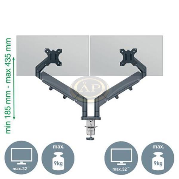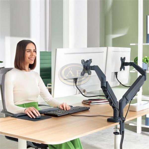 A Leitz helytakarékos kettős monitortartó-kar pozitív hatással van a testtartásra, valamint támogatja a nyak, a váll és a szem kényelmét, amennyiben a monitorok magasságát helyesen és az ajánlásnak megfelelően az ideális ergonómiai pozícióba állítják. -minden magasságban és szögben stabil marad, és könnyen válthatsz vele az álló és fekvő monitorbeállítás között -használata ideális olyan asztalokon, ahol kevés a rendelkezésre álló hely -a monitorok egymástól teljesen függetlenül állíthatók -a rövidebb karoknak köszönhetően a különböző méretű képernyők könnyen egymáshoz igazíthatók -rugós karok a monitor magasságának egyszerű beállításához (185mm-435mm) -a karra erősített monitor 180°-ban elforgatható, +90°/- 90°-os dönthető, valamint felfele, lefele, előre és hátrafele pozicionálható -erős és stabil kialakítás, ideális két 17''-32'' méretű, egyenként legfeljebb 9 kg súlyú lapos vagy hajlított monitorhoz -könnyen felszerelhető a mellékelt gyorskioldású, levehető Vesa® lemezzel (75 és 100 mm) és szilikon gumírozott U-alakú szorítópánttal, amely csökkenti a rezgéseket és védi az íróasztal felületét, vagy az asztalon található furaton keresztül (asztali vastagságtartomány: 10-80 mm) -az összeszereléshez és beállításokhoz szükséges szerszámokkal együtt szállítjuk -a kábelrendező összefogja és elvezeti a kábeleket a rendezettebb munkaterület érdekében.