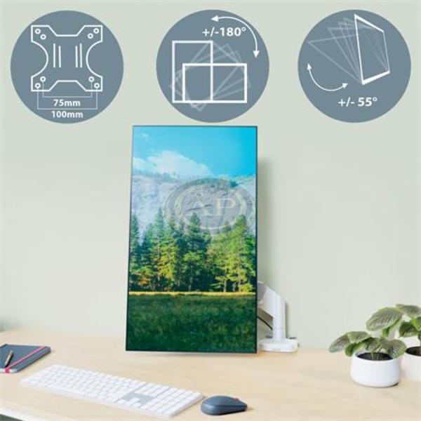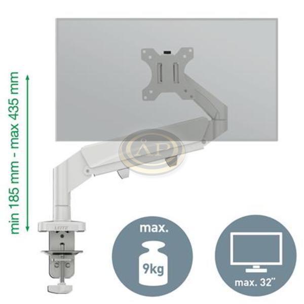 -rugós monitortartó a monitor magasságának egyszerű beállításához (185mm-435mm) -a karra erősített monitor 180°-ban elforgatható, +90°/- 90°-os dönthető, valamint felfele, lefele, előre és hátrafele pozicionálható