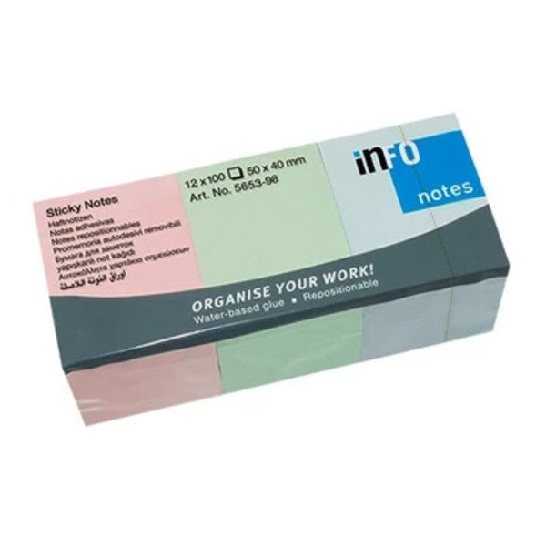 A(z) Jegyzettömb InfoNotes öntapadós, 40x50 mm, 12x100 lap, PASTEL mix egy megbízható, magas minőségű termék a(z) öntapadó jegyzettömbök és adagolók kategóriában, amely különösen népszerű a hobbi- és kézműves vásárlók körében. Használata egyszerű, dizájnja modern, és praktikus tulajdonságai miatt sokféle célra ajánlható. Kiemelkedően jól fogy ünnepi időszakokban, iskolakezdéskor vagy kreatív kampányok idején jó választás, ha boltodban keresett és értékálló terméket kínálnál.