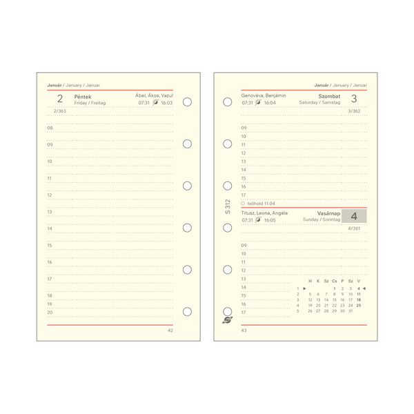 Kalendárium betét, tervező, 'S', éves áttekintő+havi tervező+napi tervező+info. Lap típusa 80 g, chamois. A pótlap mérete 'S': 78 x 128 mm